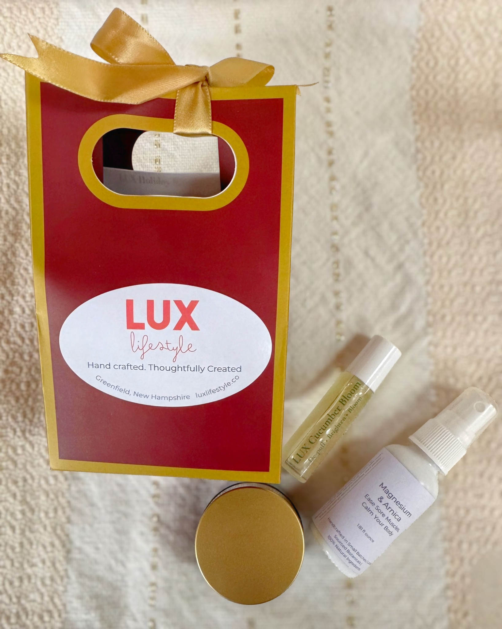 Wrapped in a burgundy-and-gold gift bag with tinsel and a printed ritual card, the LUX Holiday Ritual Set is a winter-ready gift curated for women who value intentional self-care and elevated skincare. Choose between two calming, hydrating options designed for glow and restoration.